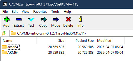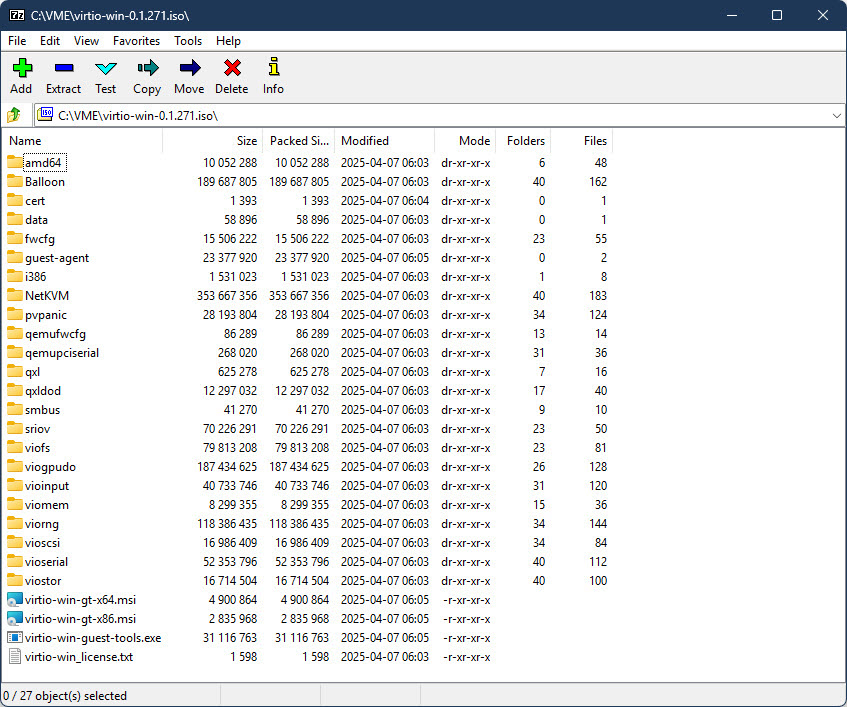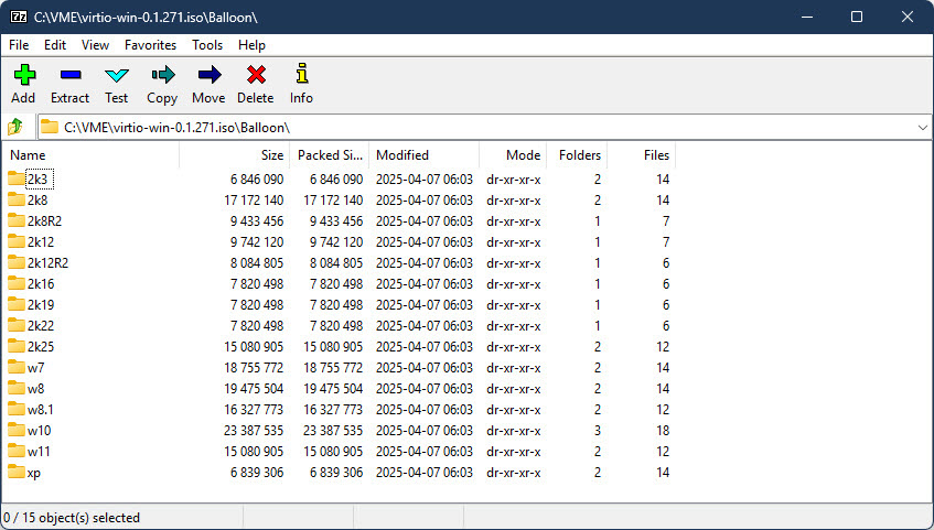 First you will want to extract the .iso image somewhere (I will be using C:\VME\virtio-win-0.1.271 here) with 7-Zip (I am going to assume you already have this .iso downloaded, if not you can find the latest version here). If you look at the contents of the .iso, you’ll find it includes drivers for many Windows OS versions including XP, W7, W8, W10, W11, plus all the server versions from 2003 to 2025.