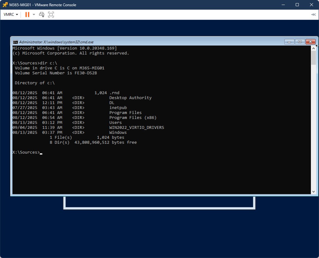 Once at the Setup Welcome screen, and within the VMware Remote Console, press SHIFT + F10 to open a command prompt and verify you can see the C: drive (including the WIN2022_VIRTIO_DRIVERS folder). If necessary scroll through all the drive letters until you find it and substitute C: for that drive letter for the next step. If you do not see your drive, then you probably need to inject the VMware SCSI drivers into your .iso image (which is a totally different blog post).